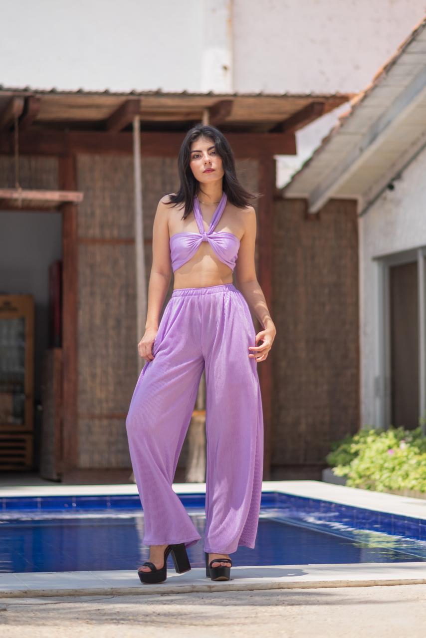 Elaborado en tela aterciopelada plisada con destellos de brillo. Pantalon enresortado de bota recta. Croptop con tiras ajustables.