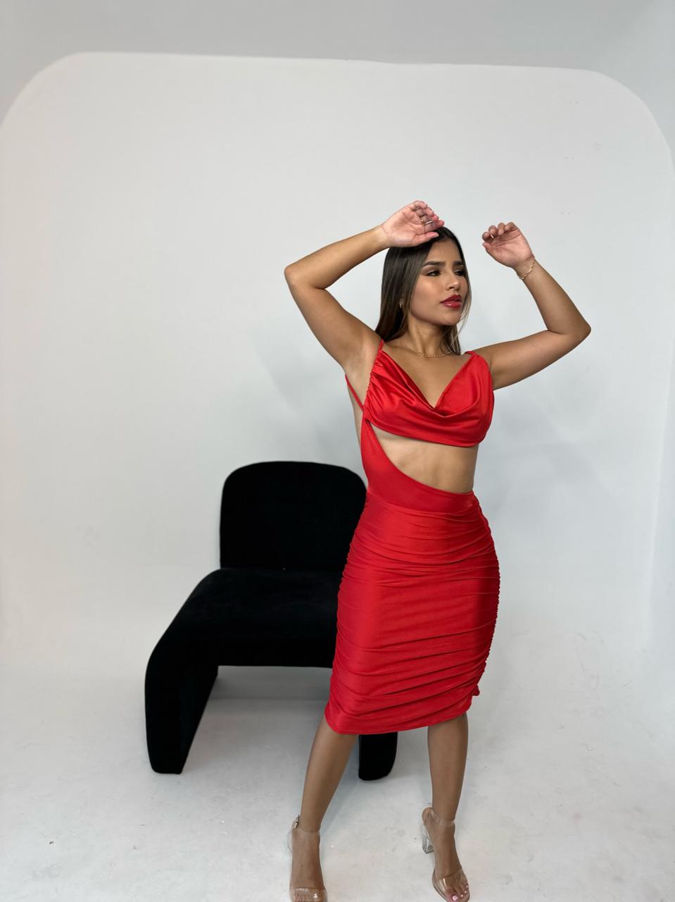 Este vestido satinado ajustado presenta un efecto fruncido que realza la silueta, combinado con un escote profundo y un cut-out en el abdomen para un toque sofisticado y moderno. Sus tirantes delgados y la espalda descubierta aportan elegancia, mientras que el corte midi define la figura con estilo. Disponible en colores vibrantes, es la elección perfecta para destacar en cualquier ocasión.